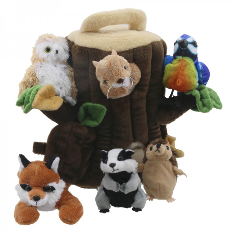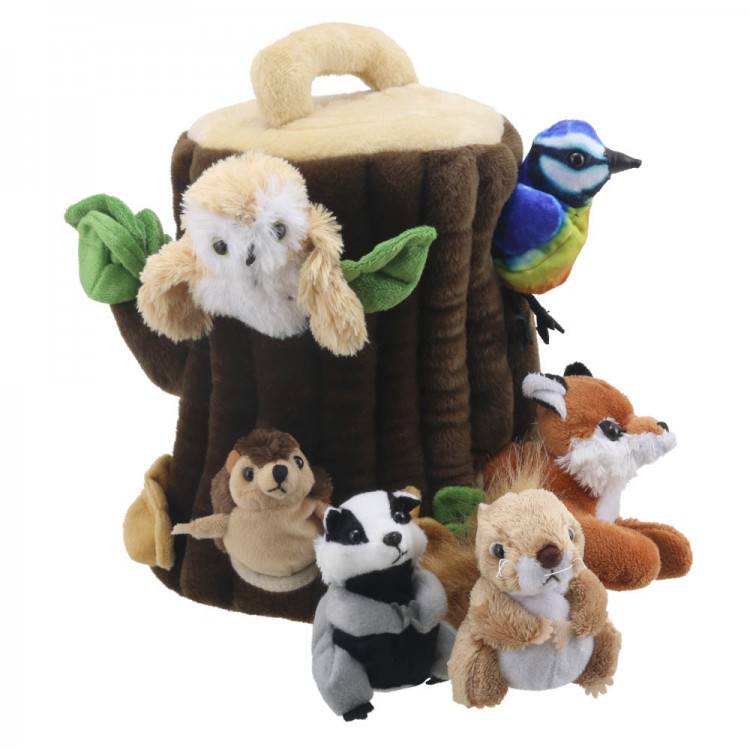 hideaway, hideaways, hide aways, set, sets, woodland, tree puppet, hedgehog, badger, owl, squirrel, fox, finger puppet sets, hideaway, hide-away, hide, treehouse, tree house,